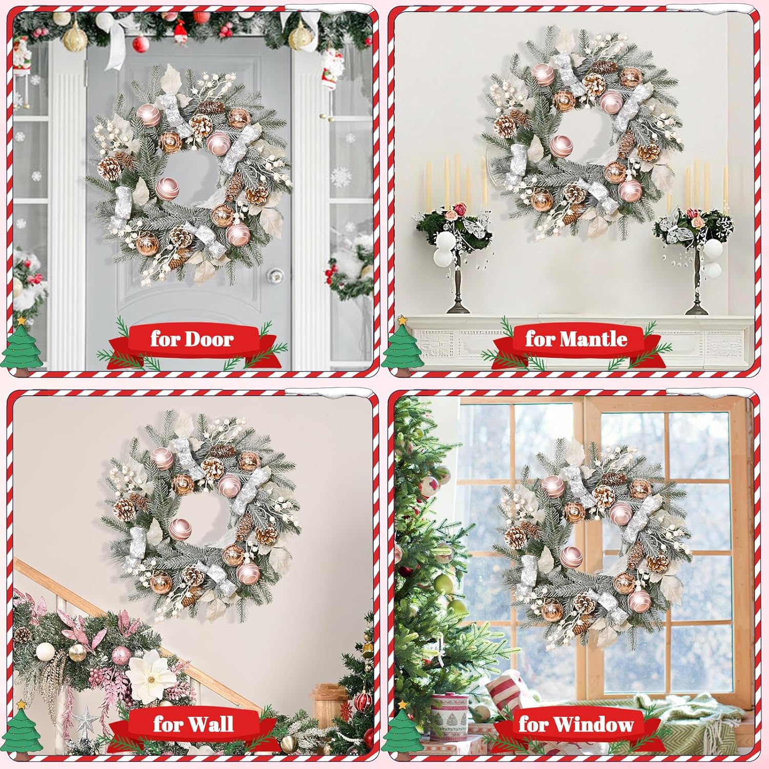 - Exquisite Christmas Wreath: Impress your Christmas decorations with our handcrafted Christmas Wreath. Exquisitely designed with a pristine white frost over its pine needles, this wreath boasts a perfect harmony of pink glittering Christmas balls, elegant bow ribbons, and delicate white berries, adorned with pretty leaves and pine cones, embodies a unity of color and craftsmanship that transforms your space into a festive winter paradise. Make your holiday decor as sophisticated as it is merry with this stunningly wreath.