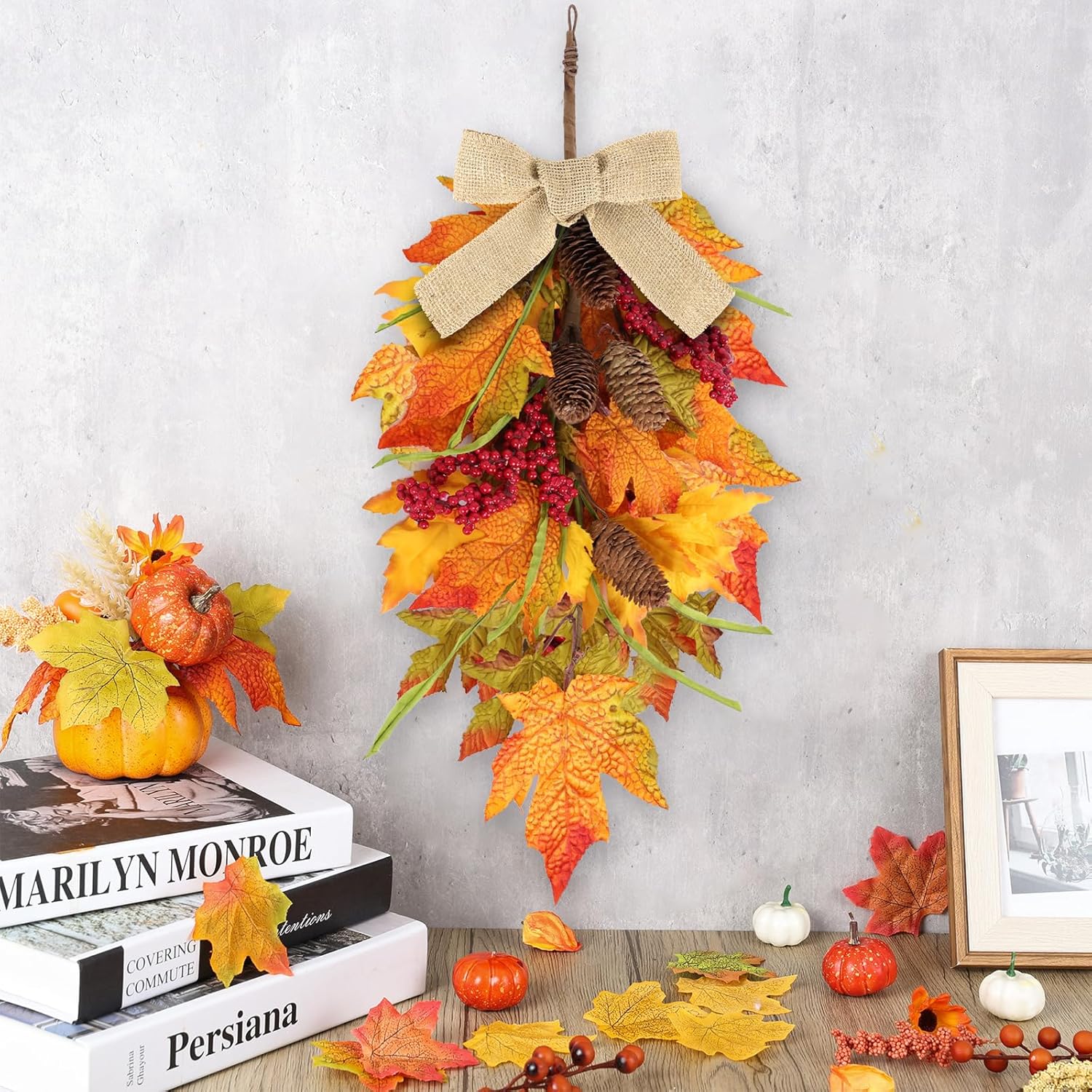 Christmas teardrop decorations are decorated with classic Christmas elements such as pine needles, red berries, bows, and Christmas balls. The top is equipped with a hanging ring for easy hanging, suitable for doors, Windows and fireplaces, bringing a perfect Christmas holiday to your home.