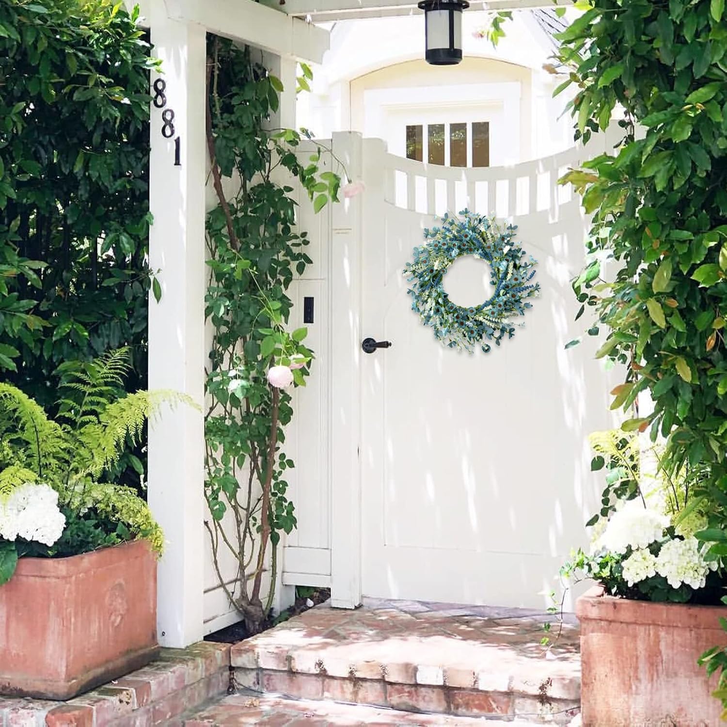 - 🍀3.【Design】:White color matches the blue, which makes the whole wreath looks cleaning and plain. Romatic, natural and perfect mediterranean style decorative wreath is a irreplaceable choice for the wedding. For embellishment, the green leaves play a important role to emphasize the theme of Spring and Summer.