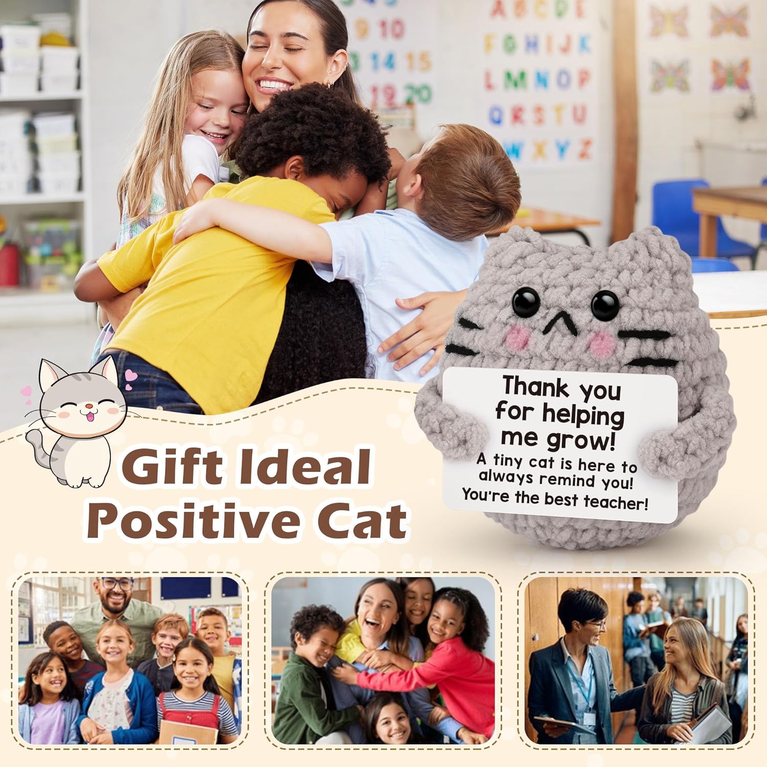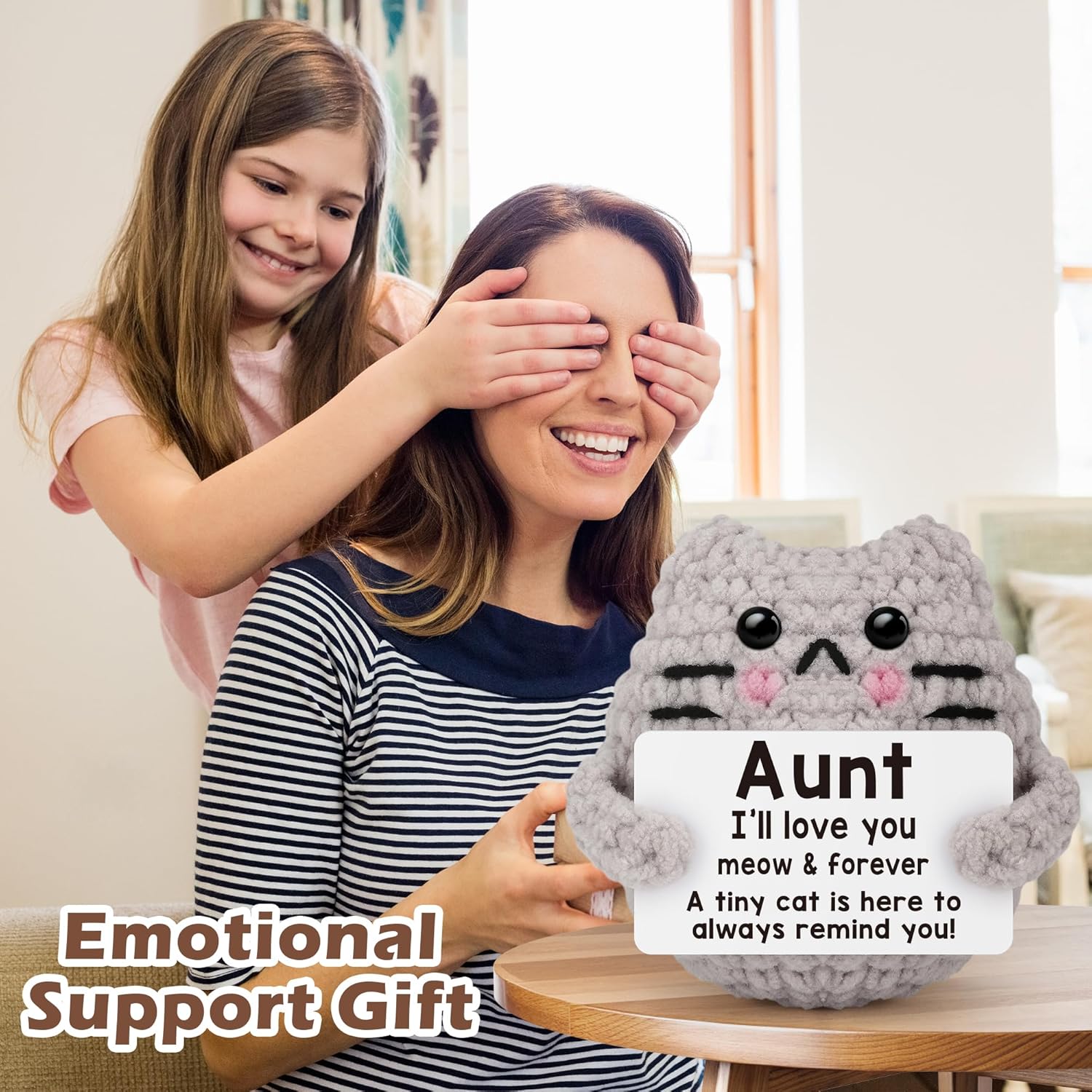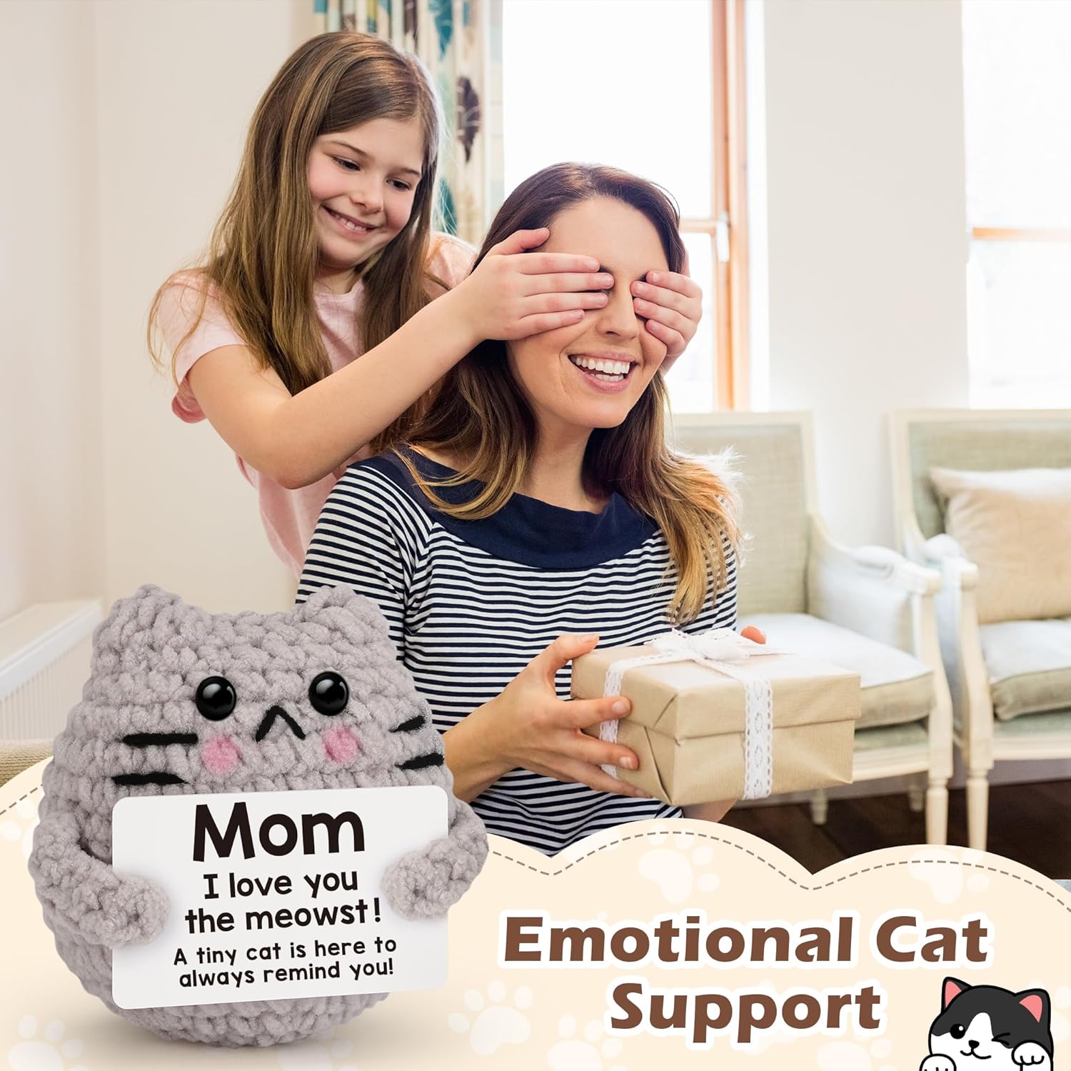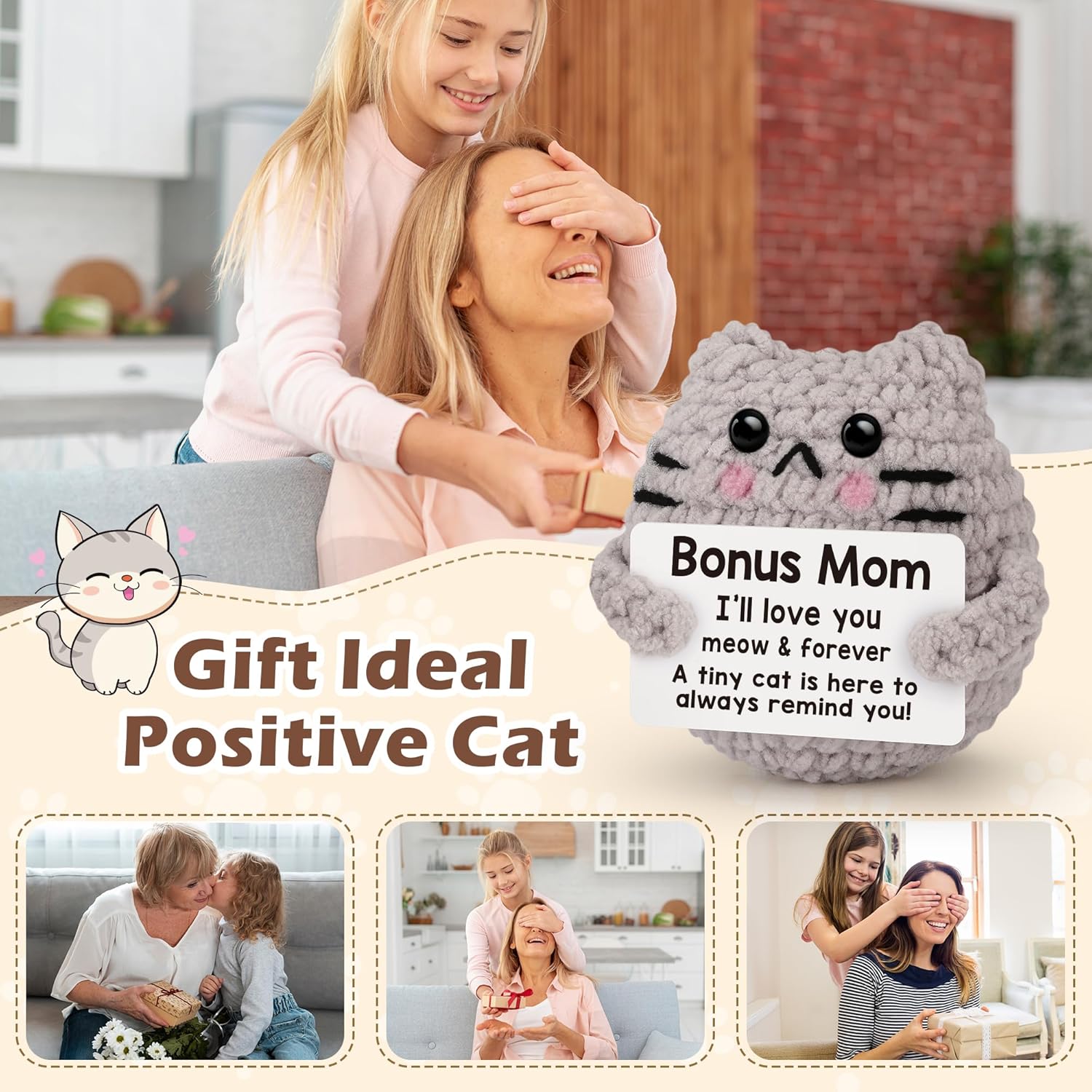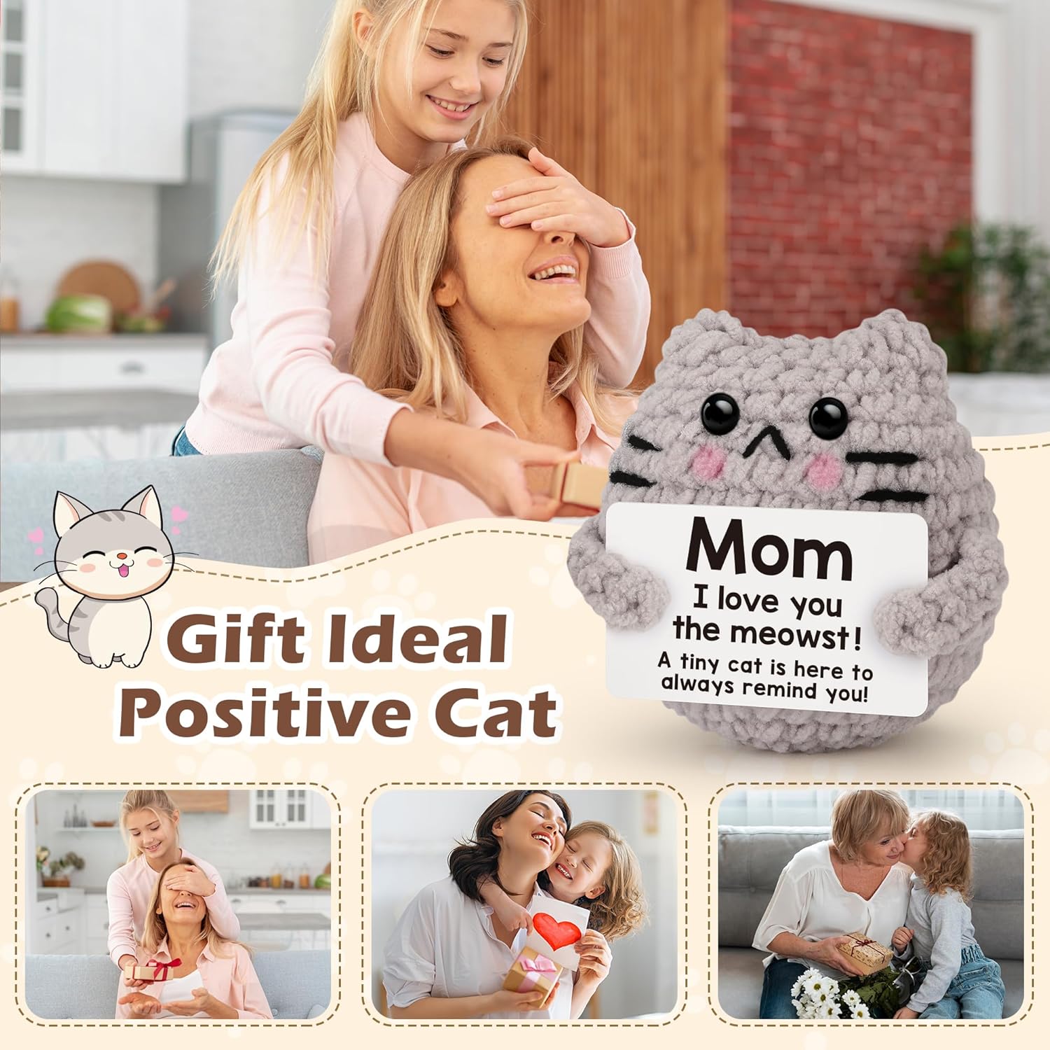 Crochet Cat Easter Basket Stuffers Positive Cat Crochet for Friend for Mom Grandma Dad Grandpa Daughter Son Gifts, Emotional Coworker Sister Brother Support Small Birthday Gifts