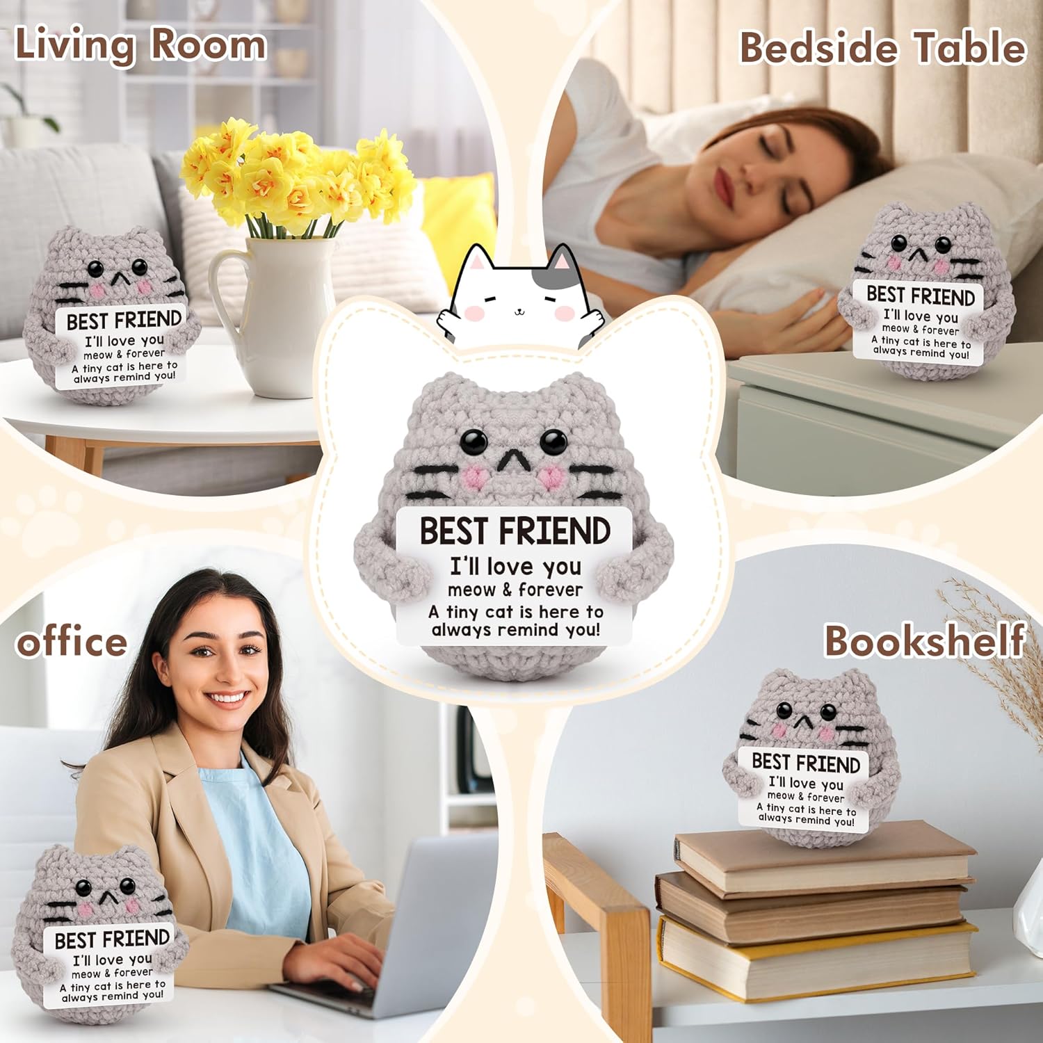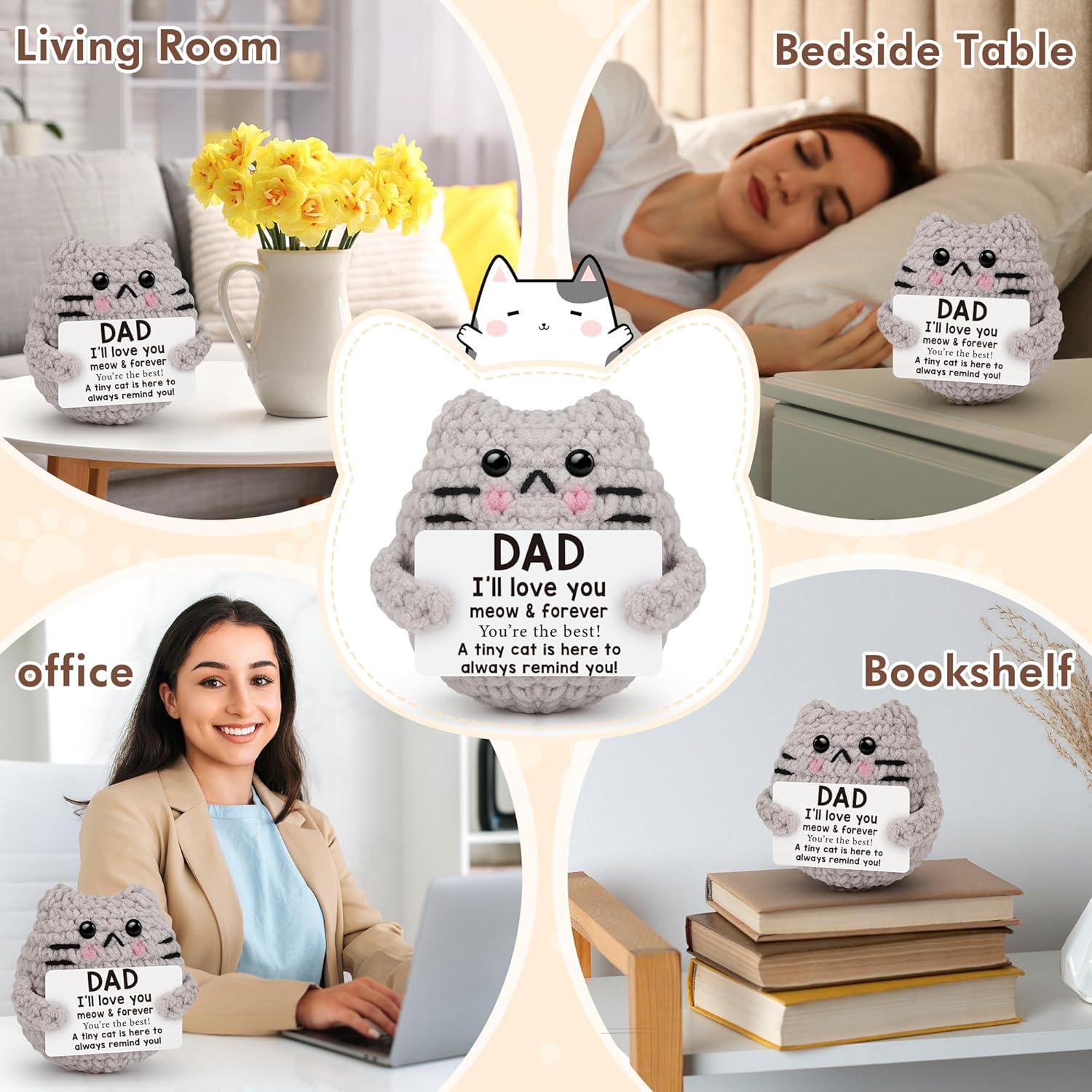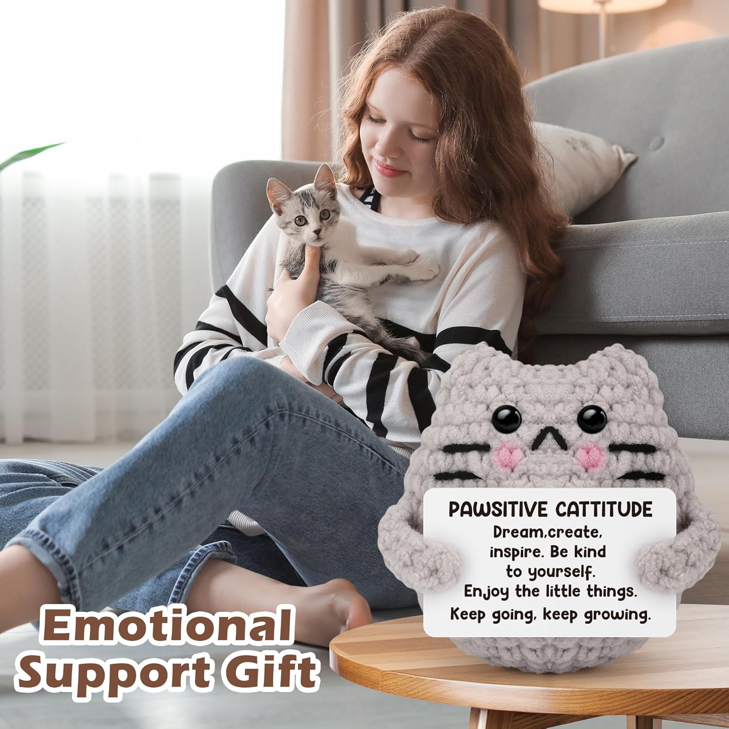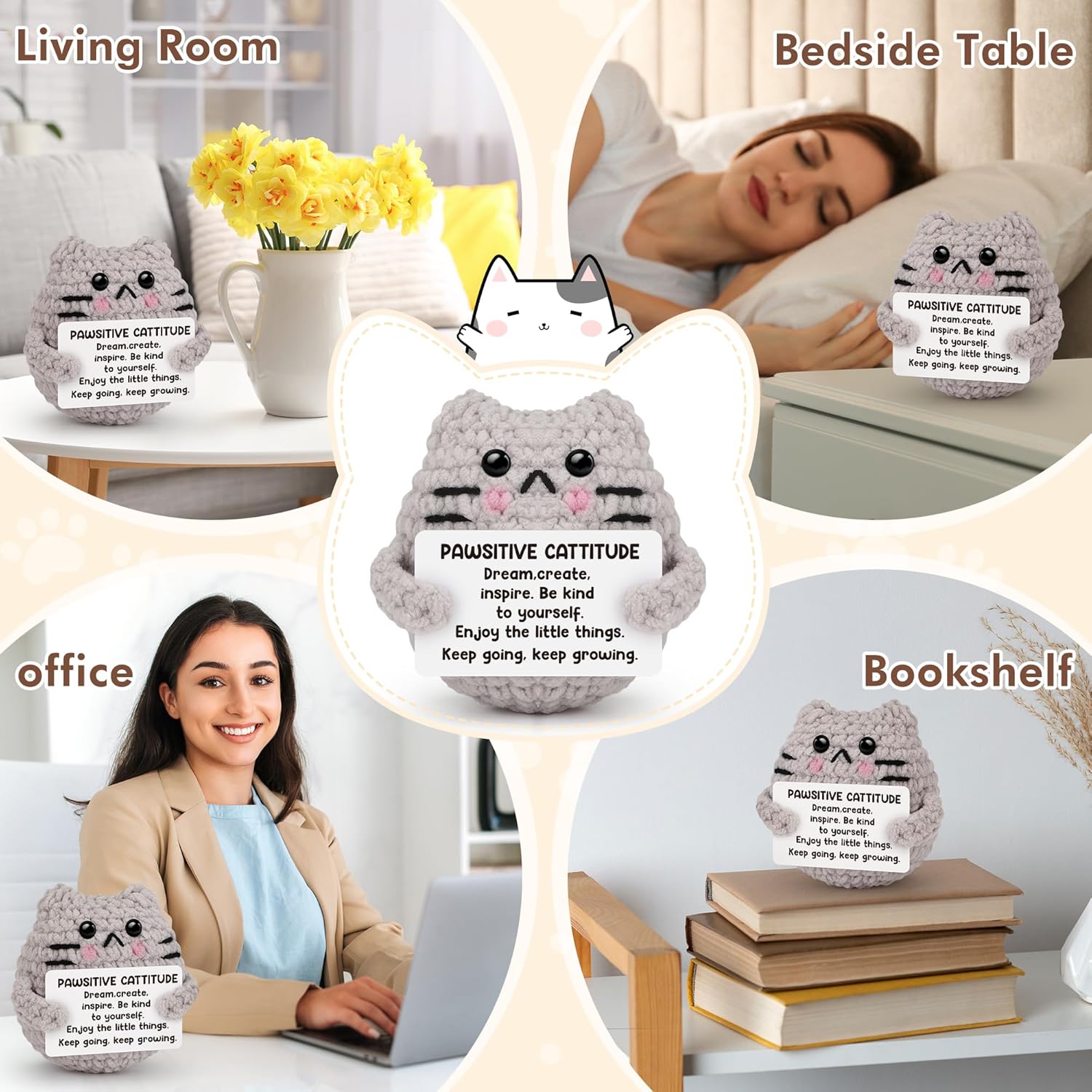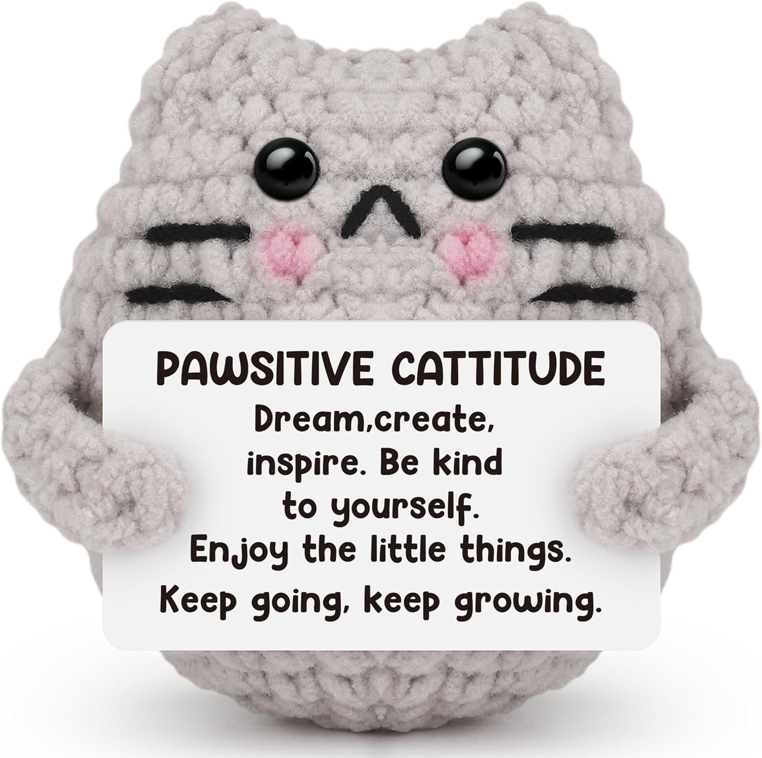 - 【Cute Positive Cat】: This crochet Cat is more than just a charming desk decoration; it's a heartfelt reminder that you are awesome,and features motivational words "Dream,create,inspire,Be kind to yourself,enjoy the little things,keep going,keep growing" on the card. It's the perfect gift for bestie, sister, and young people who need a little encouragement and a reminder of their own worth.