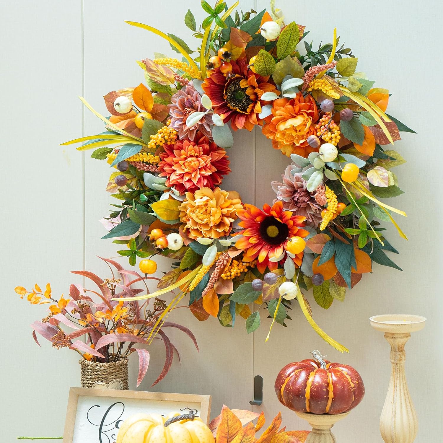 - πΌ Realistic Autumn Wreath Details β Designed as a premium autumn wreath for front door, it features artificial dahlias, pumpkins, eucalyptus, and vibrant fall leaves. Each element is crafted with care using high-quality silk fabric, giving the wreath a lifelike look and soft touch.