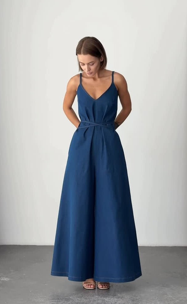 Minimalist Style Deep Blue V-Neck Spaghetti Strap Waist-Cinched Wide-Leg Jumpsuit