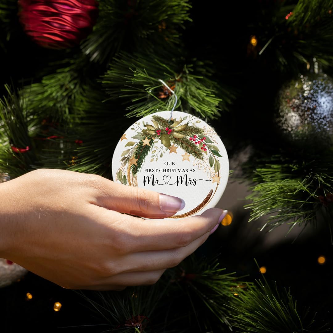 - π New Ornaments Wedding: Add a touch of elegance to your dΓ©cor with these ornaments wedding pieces, perfect as a gift for married couples Christmas celebrations! Each first year married ornament is permanently laminated directly onto the Christmas ornament, creating an image that does not peel or fade. The best Christmas gift for couples, including an ornament first Christmas married, makes this wedding Christmas gift ideal for couples gifts for Christmas, such as a Mr. and Mrs. ornament or a Christmas ornament for newlyweds.
