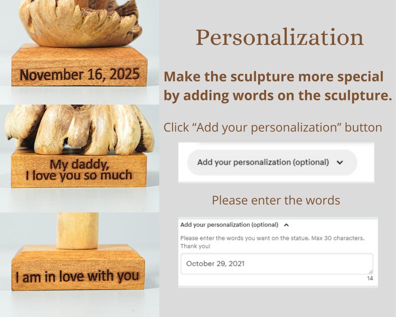 As the finishing touch, we choose to use a clear coat, to maintain the natural color of the wood. This statue is perfect for decorating your home or as a gift for loved ones.
